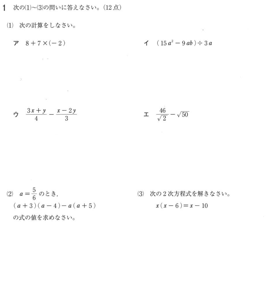 2026年度の入試でも、例年通り基本に忠実な計算問題が出題されました。 大問1の構成は、静岡県入試における「王道」の以下の6問です。