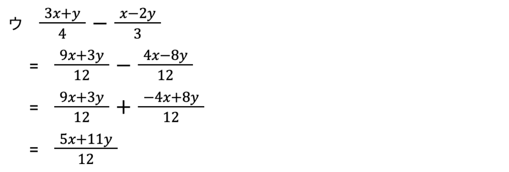 • 引き算の場合、中央の「-」は、右側の分数の分子に分配されるので注意です。